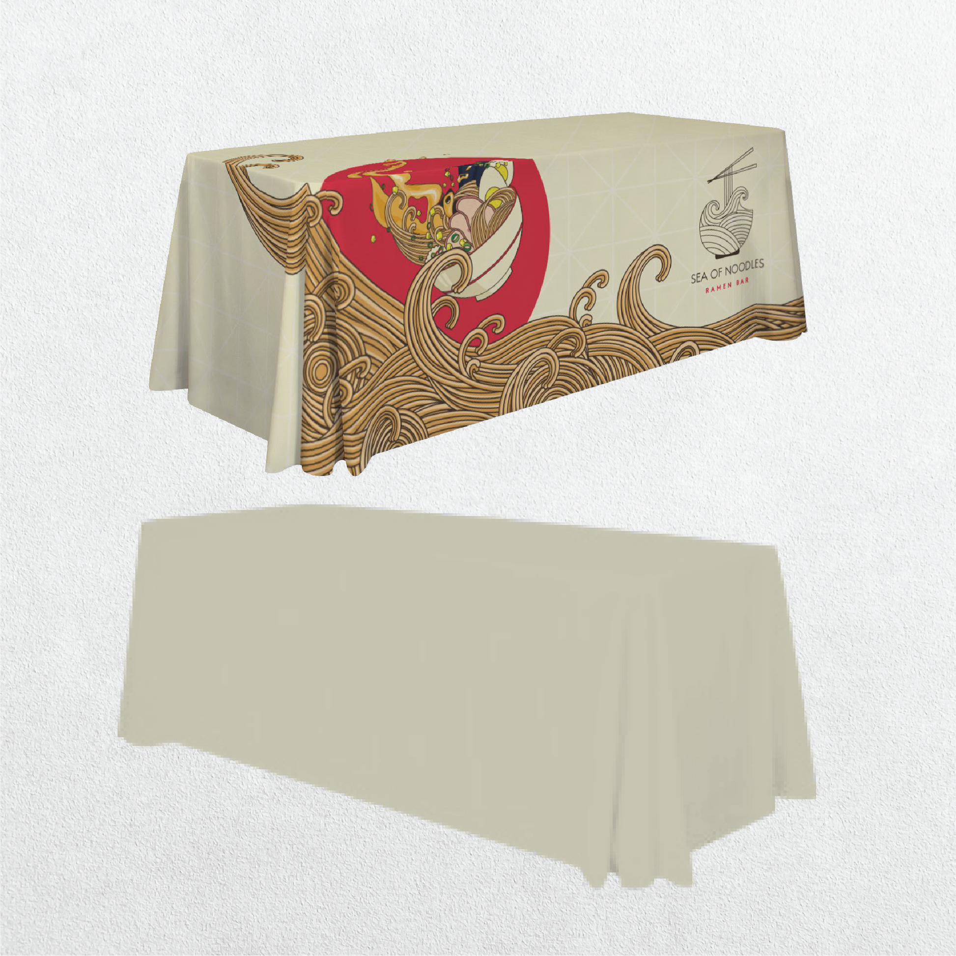 Our Premium table drapes feature a heavy duty WRINKLE FREE material. All sizes are flame retardant. These drapes can be machine washed after use. Drapes come in 4-sided and 3-sided options and are produced using screen-printing.
